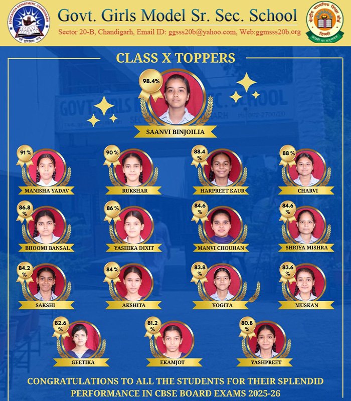 Govt. Girls Model Sr. Sec. School Sec-20 B was established in the year 1960. The School comes under the purview of Education department, an efficient component of the Chandigarh Administration. It is one of the three all girls schools in Chandigarh. The school located in the heart of the city is housed in a grand building consisting of three well lit and well ventilated blocks amidst lush green and huge playgrounds.